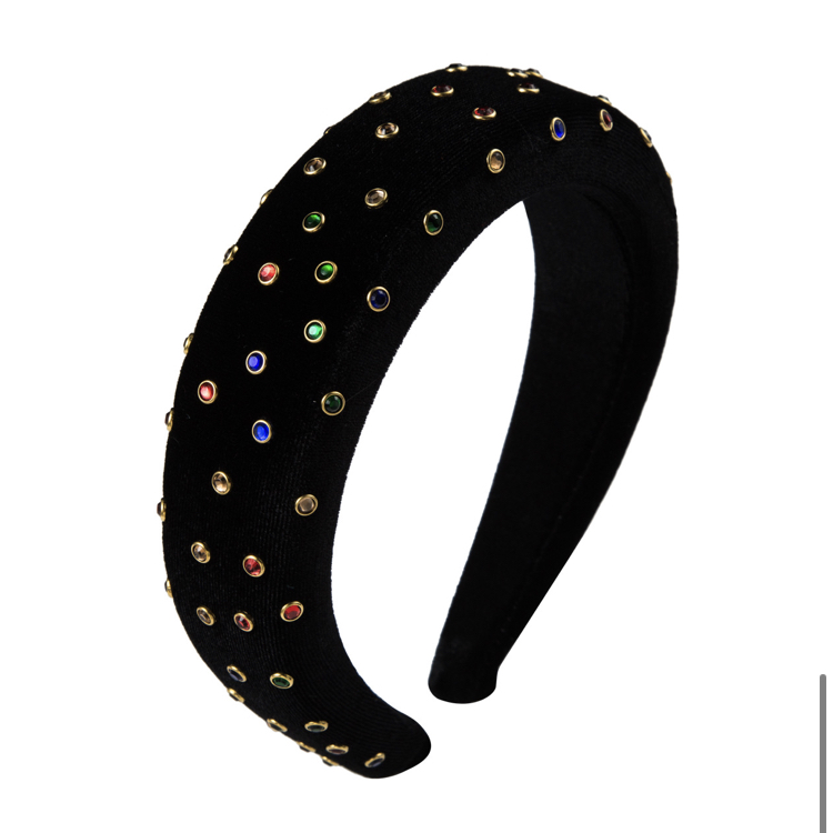 A final touch of opulence is easily achieved with our Bridgette embellished velvet headband. Shaped from plush black velvet and accentuated with multi-coloured gems, this padded design is perfect for giving your AW outfits a touch of luxe.