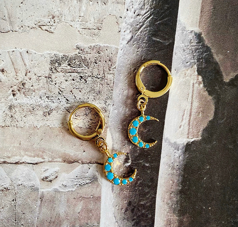 Brighten up your look with our Cadence Turquoise Moon Huggie Hoop Earrings. Featuring a vibrant turquoise moon design, these dainty hoops are the perfect accessory to add a pop of colour to any outfit. Whether dressing up for a special occasion or adding flair to your everyday style, these earrings effortlessly combine charm and modern elegance.