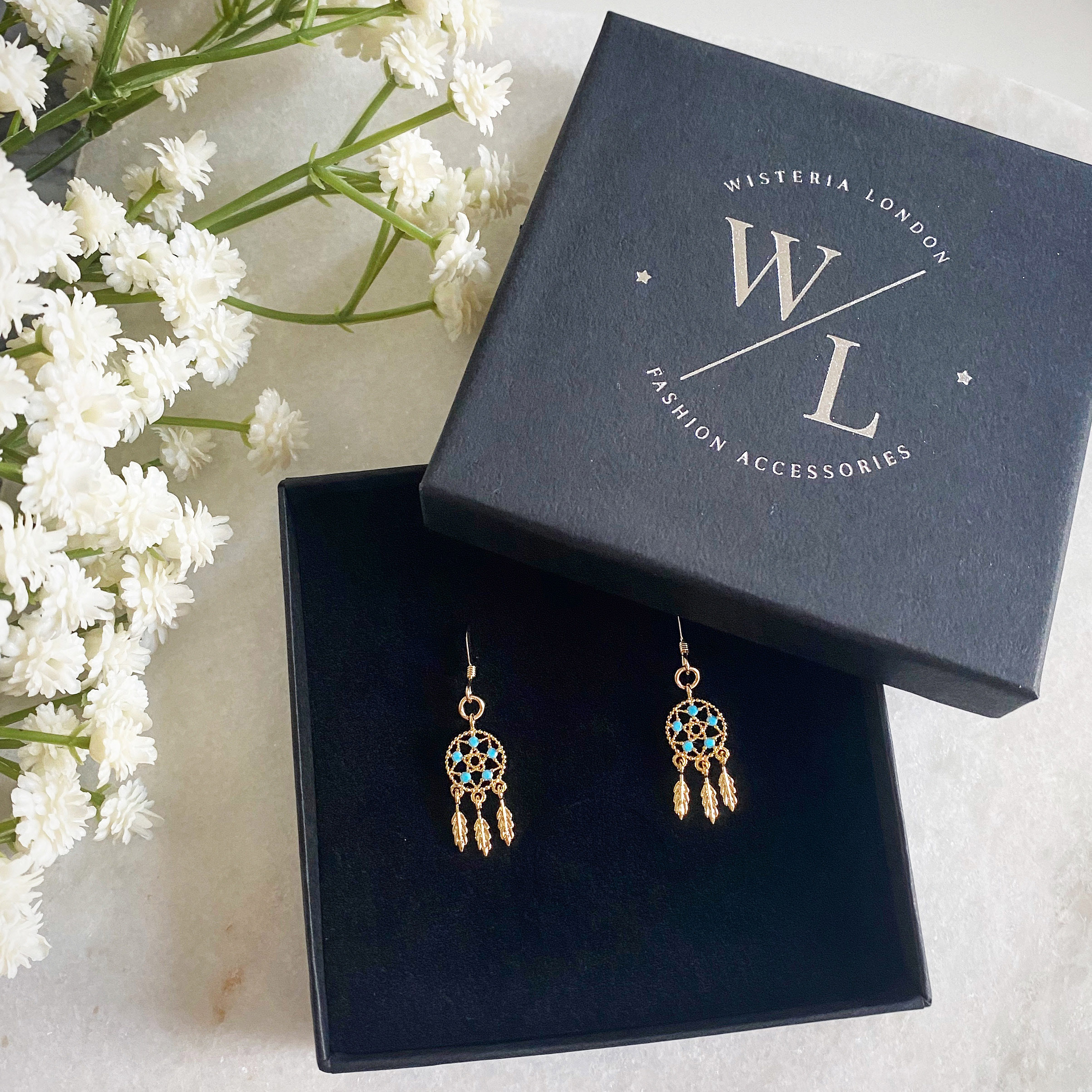 These beautiful and unique dainty gold dreamcatcher earrings will enchant and delight no matter what the occasion. It is believed that the web on the dreamcatcher catches the bad dreams, whilst the feathers act as a fluffy pillow-like ladder for the good dreams, allowing them to gently descend upon the sleeping person without disturbing! The perfect gift for life’s dreamers. Send to protect the wearer against negative energy!