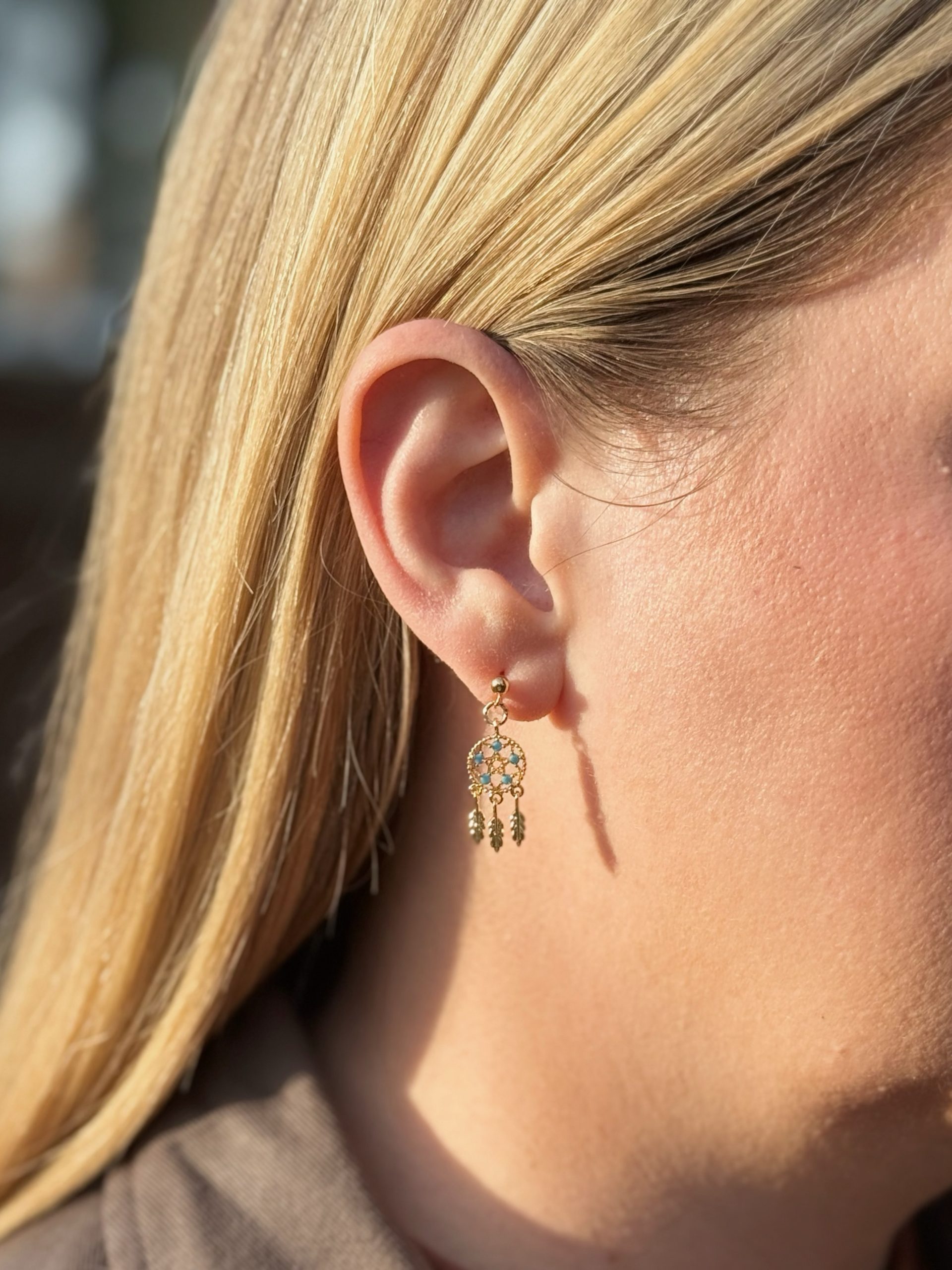 Add a touch of boho charm to your everyday look with our Dainty Gold Dreamcatcher Stud Earrings. These delicate earrings feature a finely detailed dreamcatcher design, symbolising positivity, protection, and the sweet dreams you deserve. Perfectly sized for everyday wear, they bring a subtle yet enchanting statement to any outfit.