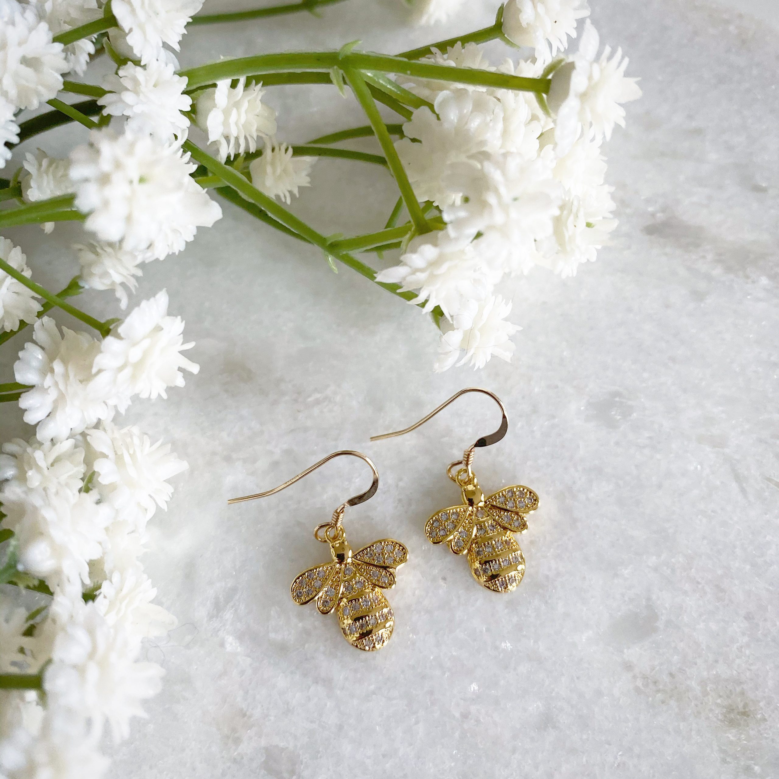 Our queen bee CZ earrings gold are a standout piece and perfect for so many occasions. The bee is a symbol of brightness, personal power, strength and the idea that anything is possible. A true classic and perfect for so many occasions. Suspended from gold filled ear wires they are the perfect piece for all occasions. Studded with tiny CZ crystals that glitter and catch the light, these little lucky bee earrings are perfectly formed and beautifully detail