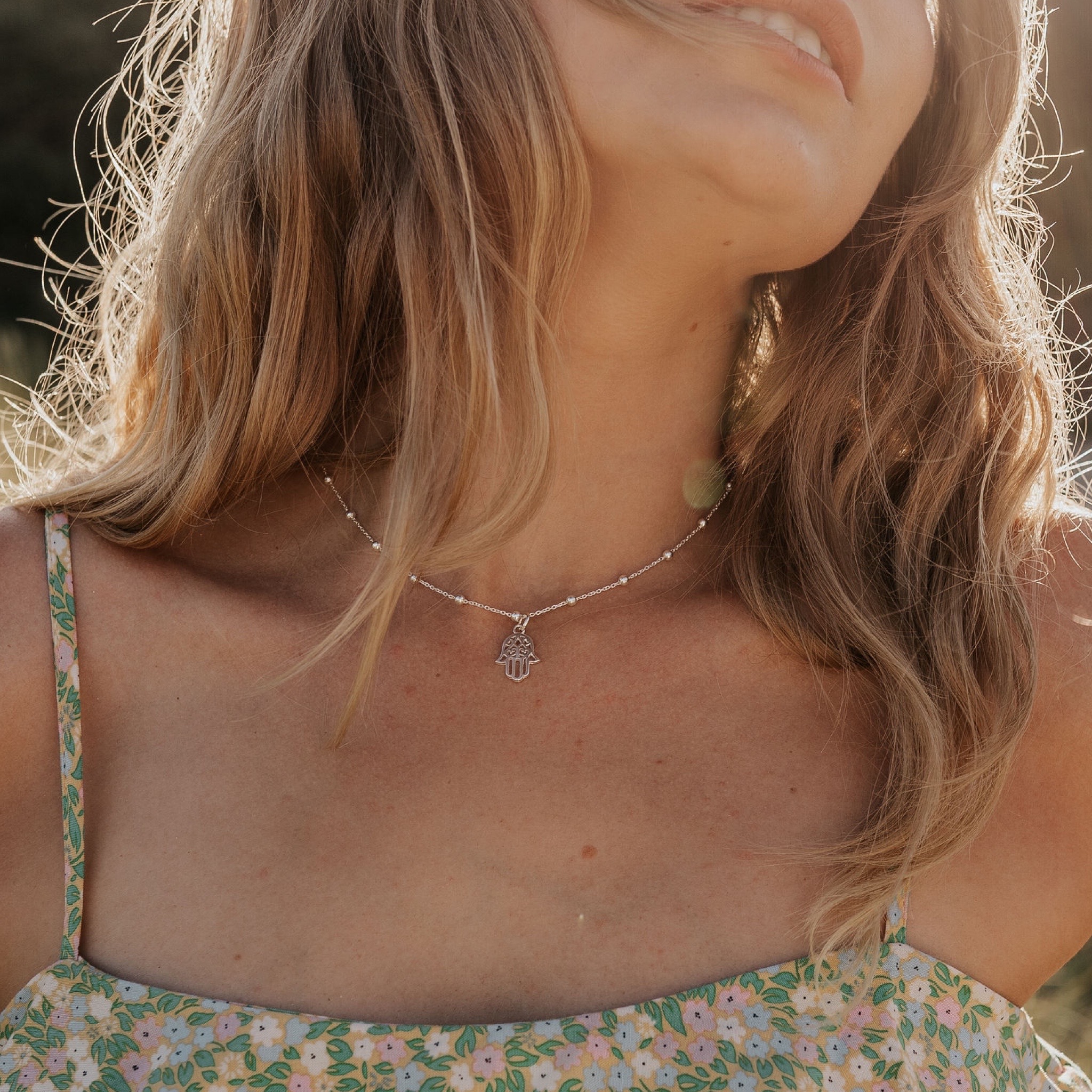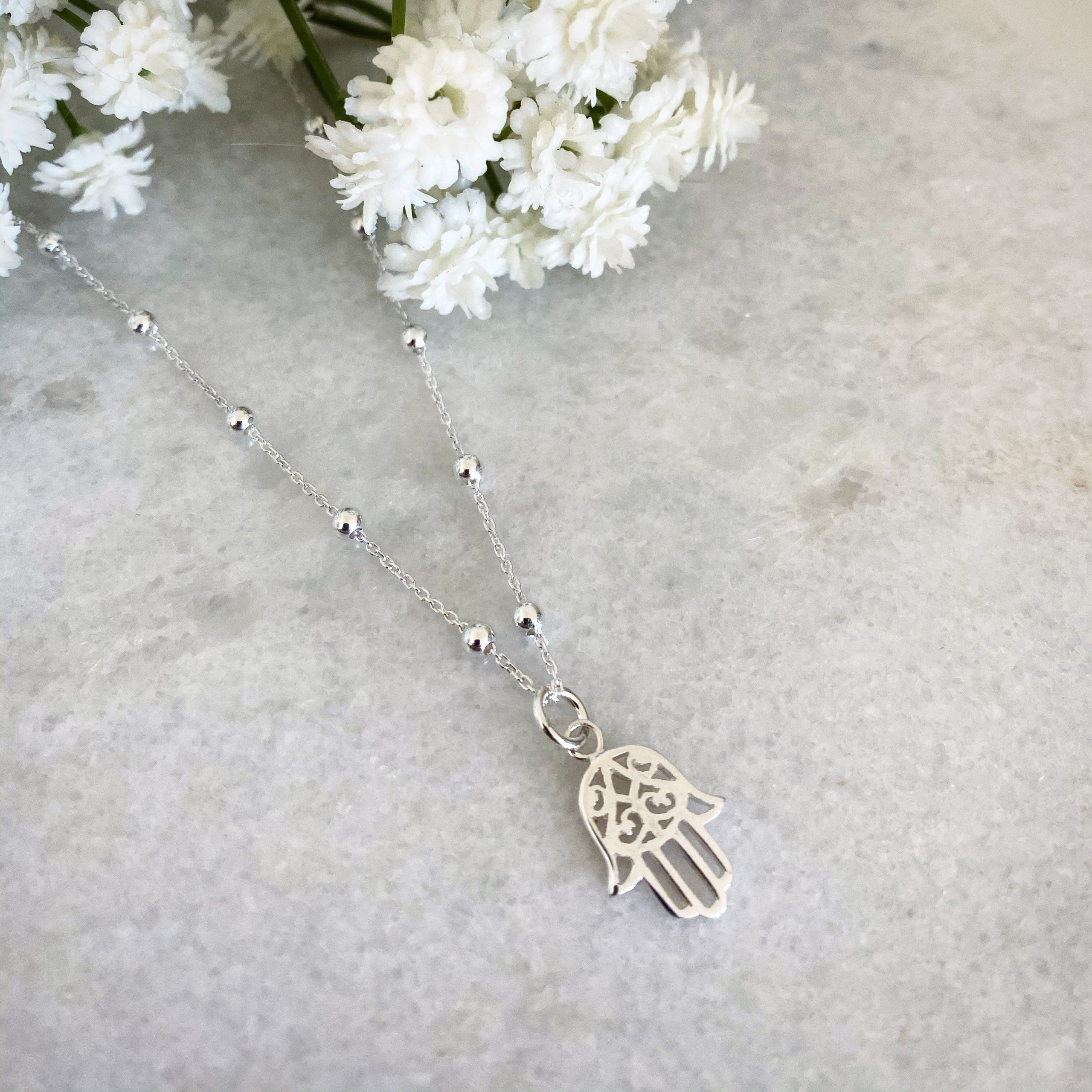 Sterling Silver Hamsa Hand Necklace on Bobble Chain